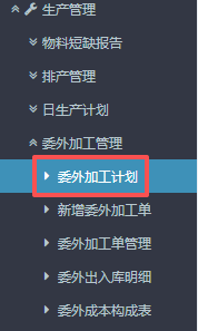 進入ERP系統之后,在左側的功能菜單里找到“生產管理”,點開“委外加工管理”,點擊“委外加工計劃”。