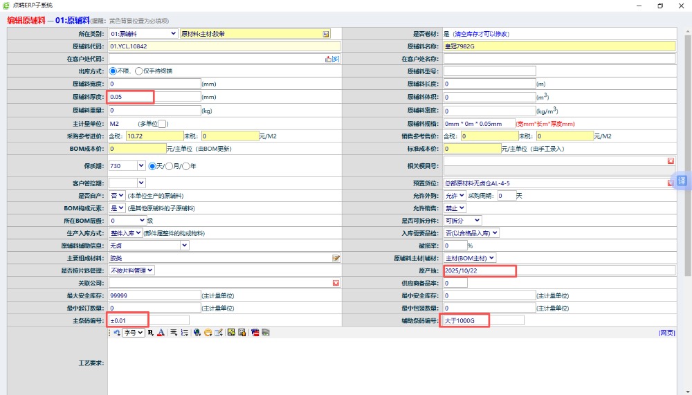答:針對這個問題可以先在“系統(tǒng)管理”》“物料信息維護”中找到對應物料,然后對物料信息進行編輯,如:物料厚度、主條碼編號和服輔助條編碼進行修改。