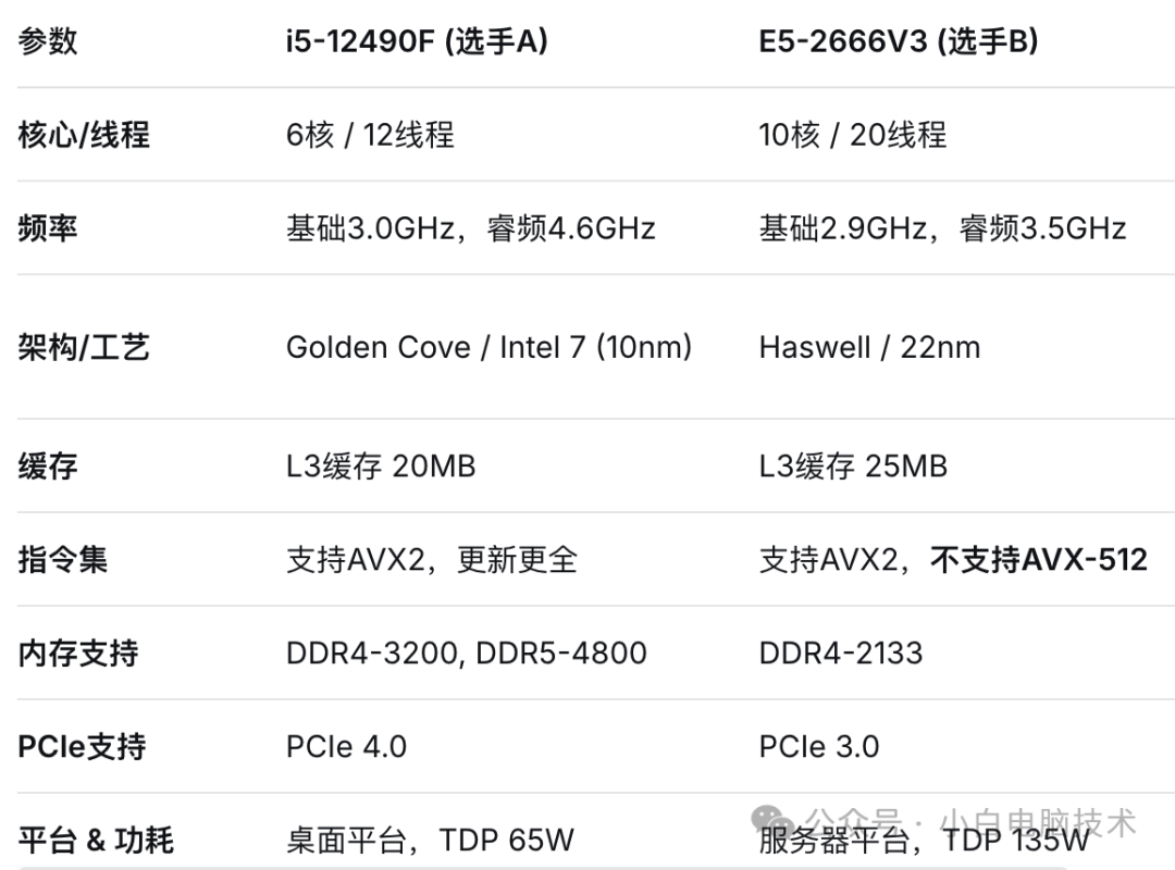 很多朋友在選配電腦時,總會盯著一個參數——CPU。而關于CPU,最讓人困惑的問題之一就是:“這個CPU有多少個線程?是不是線程越多就越牛?” 今天,小白就來講講這個問題。為了讓大家有最直觀的感受,我們會請出兩位風格迥異的“選手”:酷睿i5-12490F和至強E5-2666v3。看完它們的對決,你自然會找到答案。 酷睿i5-12490F